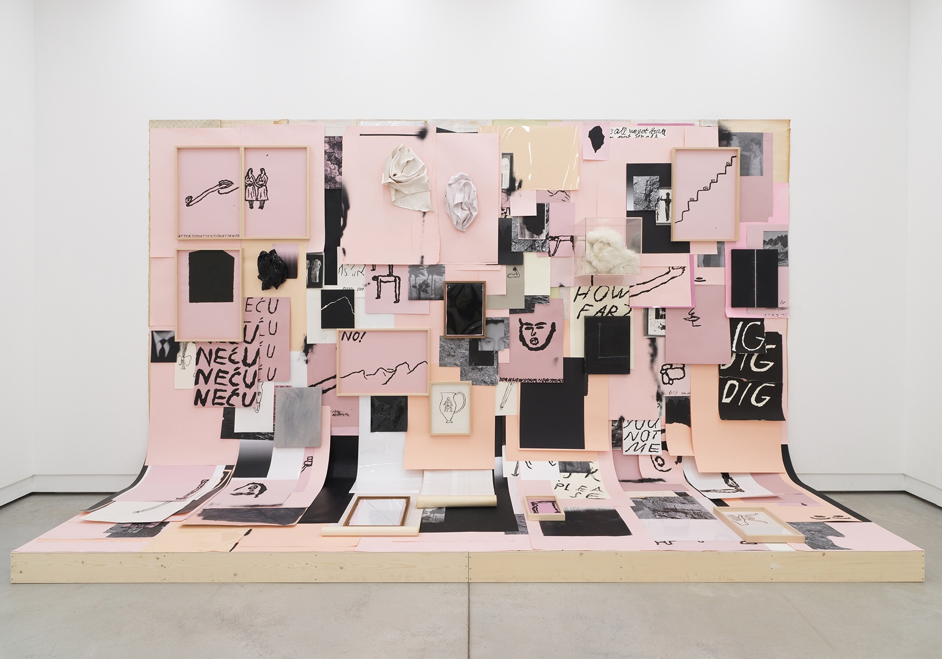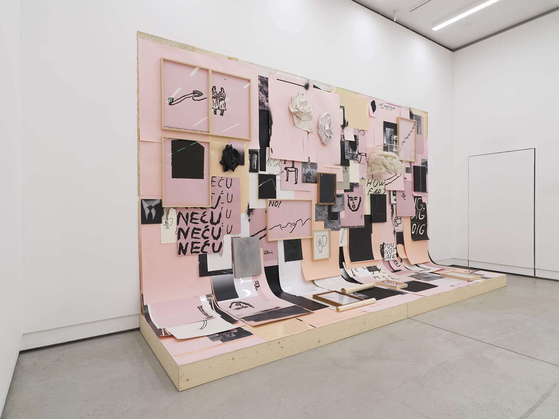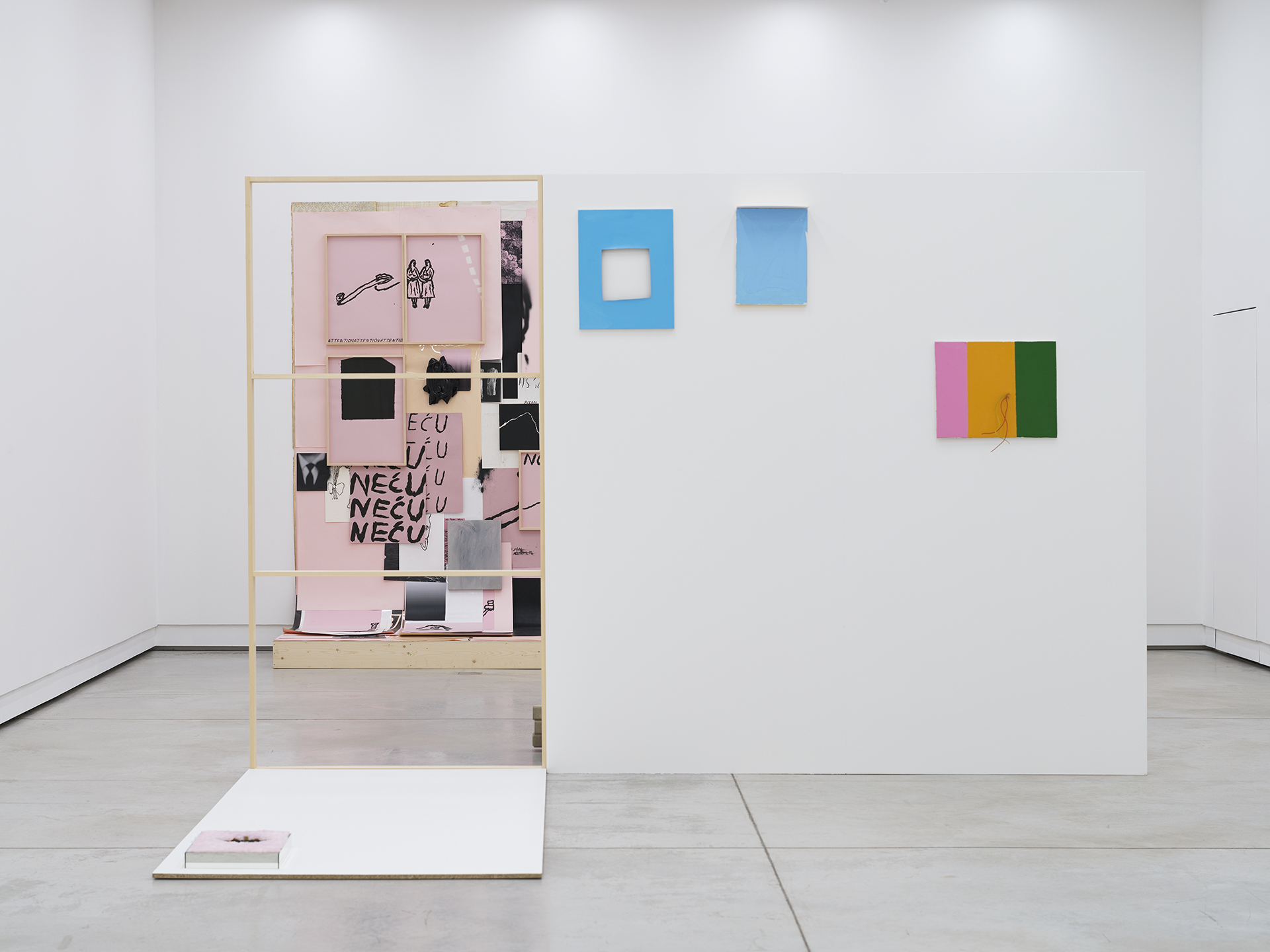 By combining diverse media, the artists treat the entire exhibition space as a blank canvas onto which they gradually layer associations and, through mutual dialogue, assemble fragments of stories that shape a more complex narrative. The dynamic and seemingly effortless collage is weighed down by individual and collective memories, comments, and imprints of the past and present, which the artists share from the perspective of women, creators, freelancers, and migrants. Both have been marked by the experience of emigration and the legacy of former Yugoslavia, a space that in recent decades has undergone a radical socio-political transformation: the decline of the socialist system, the rise of neoliberalism, accompanied by economic and, ultimately, health crises, general uncertainty, and the radical digitalization of life. In the context of constantly changing social conditions, unstable politics, and shifting cultural dynamics, the artists today explore questions of belonging and the sense of home in both foreign and primary environments, addressing issues of origin and identity. The very motif of the work and their understanding of their own roles have been fundamentally shaped by references to women’s struggles and the position of women in the past and present. In doing so, they adopt a distinctly engaged stance, with an awareness of the vulnerability of the position paved by the generations of women before them. The feminine and sensitive aesthetic that characterizes both authors, despite its apparent fragility, thus reveals themes of emancipation and a decisiveness behind the artists' gestures and actions.
