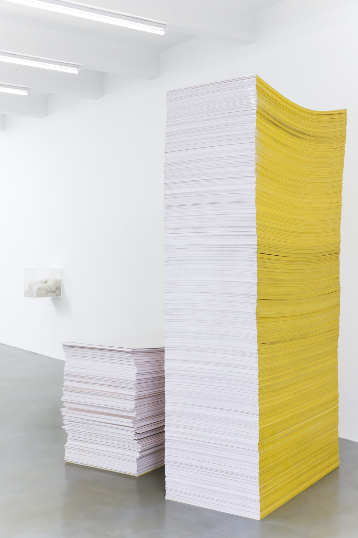 Košir has an umbrella term for her installation, sculptures and graphic works on display: “Love is Real”. Is this her observation, the wise conclusion of her life’s tribulations, or is this a plea and a wish directed at the universe? The large stack of plastic sheets that massively take over the first room of the gallery, like giant pieces of paper stacked up on a desk, look delicate and are painted partially pink by Košir, giving them an airiness that belies their actual weight of over four tons. It was a tour de force of the staff to install this work that brings such powerful Minimalist sculpture energy to the beautiful Altbau rooms of the gallery. All of the works on display have been created from the remnants of materials left behind in the studio of her deceased father, an industrial designer. Using his materials, giving new life to them, examining and handling them, are ways that Košir has found to manage the pain that her relationship with her father created in her soul.